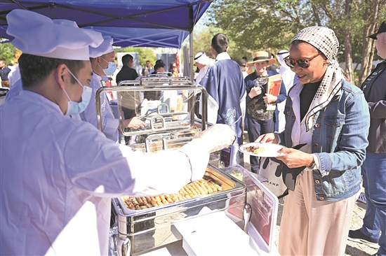 當地時間3月9日,在科威特首都省賈比爾文化中心,人們體驗中國美食。新華社發(阿薩德 攝)