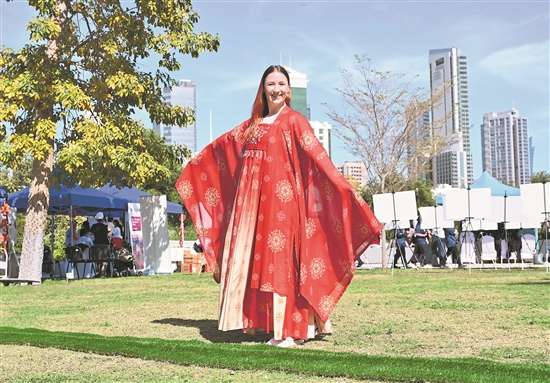 當地時間3月9日,在科威特首都省賈比爾文化中心,一名女子體驗中國傳統服飾。新華社發(阿薩德 攝)