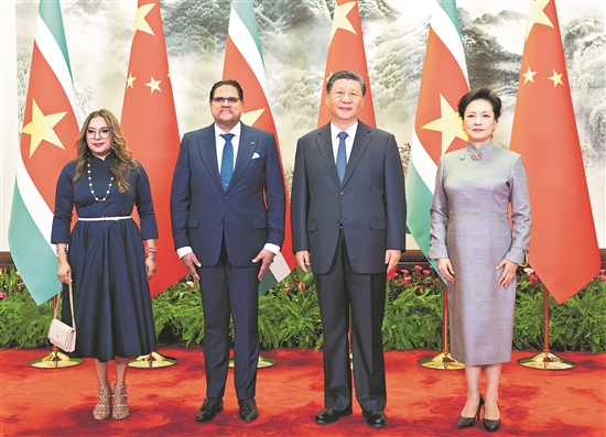 習近平指出,中蘇友誼源遠流長、歷久彌堅。蘇里南是第一批同新中國建交、同中國建立戰略伙伴關系以及同中國簽署共建“一帶一路”合作規劃的加勒比國家之一。兩國始終相互尊重、平等相待,成為南南合作的典范。中方愿同蘇方一道努力,進一步鞏固政治互信,加強經貿合作,擴大人文交流,密切國際協作,推動構建更加緊密的中蘇戰略合作伙伴關系,更好造福兩國人民。
