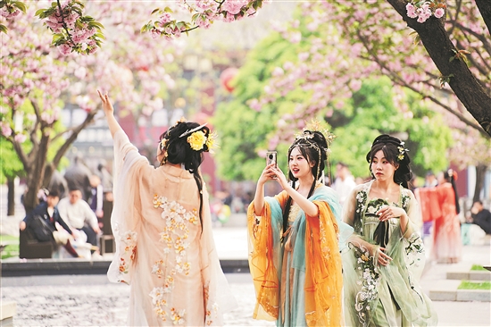 近年來,在古都西安,身著傳統服飾出行成為一種時尚,受到越來越多年輕人的追捧。 新華社記者 邵瑞 攝