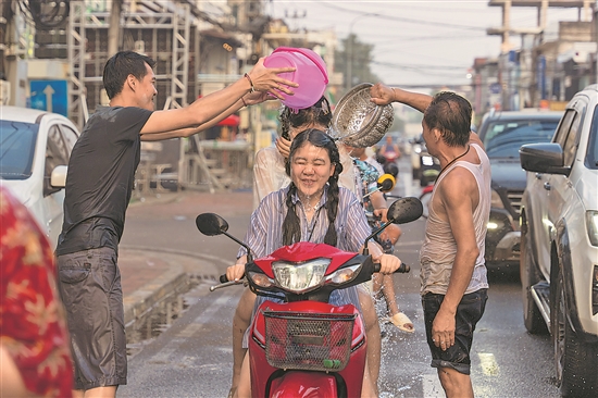 當地時間4月13日,在老撾首都萬象,人們在街頭參加潑水節慶祝活動。4月13日至18日,老撾迎來一年一度的潑水節。潑水節也稱宋干節,是老撾的傳統新年。