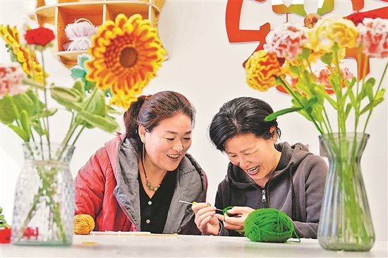4月14日,在山東省菏澤市巨野縣鳳凰社區黨群服務中心“巧手工坊”,居民正在鉤織手工藝品。