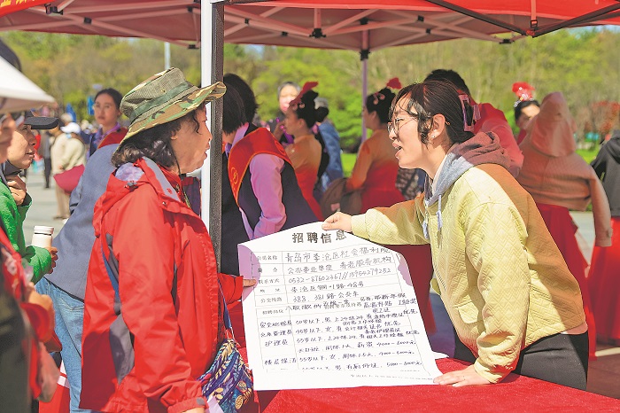 4月17日,“筑夢李滄養老 護佑銀發安康”養老服務人才專場招聘會暨養老服務大集在山東省青島市李滄文化公園廣場舉辦。招聘會現場,10家養老機構提供養老護理員、醫護、院長助理等各類就業崗位需求百余個,吸引眾多求職者前來咨詢應聘。近年來,李滄區大力開展養老護理職業技能培訓,不斷培養養老服務人才。本報通訊員 張鷹 攝