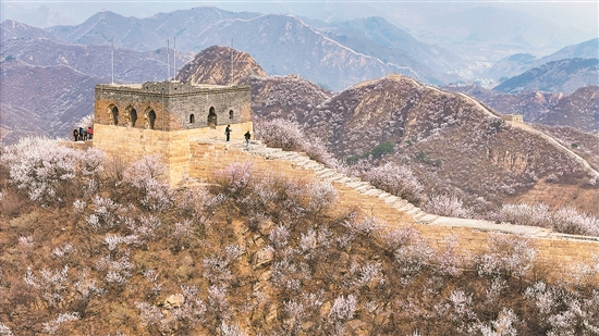 春日里,長(zhǎng)城如巨龍?jiān)谏介g蜿蜒,城墻內(nèi)外山花爛漫,勝景引人。