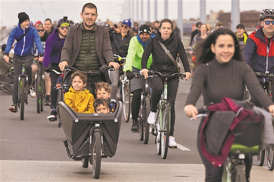 當地時間4月20日,在匈牙利首都布達佩斯,人們參加自行車騎行活動。當日,匈牙利布達佩斯舉辦自行車騎行活動,倡導人們低碳出行,并迎接世界地球日的到來。今年4月22日是第55個世界地球日。新華社發 (弗爾季·奧蒂洛 攝)