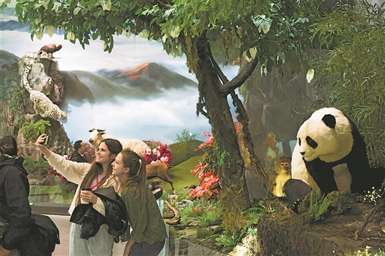 4月22日,參觀者在四川省雅安市寶興縣大熊貓國際文化交流中心內拍照。當日,寶興縣大熊貓國際文化交流中心開館。新華社記者 胥冰潔 攝