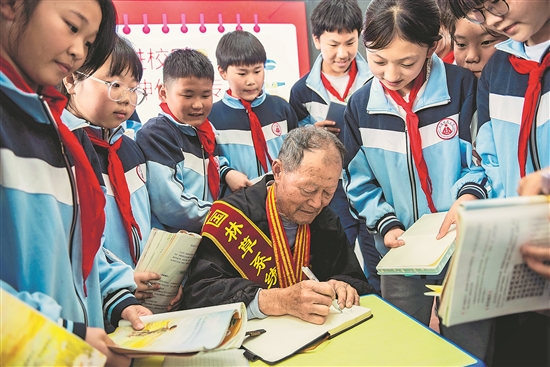 4月24日,在安徽師范大學附屬含山實驗小學,全國勞動模范、中國好人、全國“最美志愿者”、全國綠化標兵、安徽省道德模范易厚掌為學生們講述自己綠化荒山的奮斗故事。圖為小學生邀請易厚掌簽名。