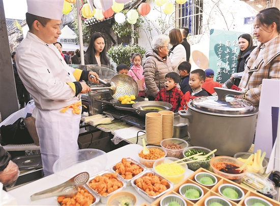 在浙江省湖州市小西街舉辦的新春市集上,“浙江工匠”蔡林榮(左)為人們制作當地特色小吃細沙羊尾。