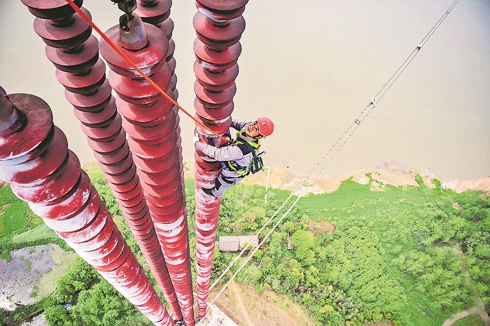 吳維國在高壓線上“走線”。
