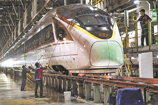 5月1日,清洗保潔人員在鐵路天津動(dòng)車客車段動(dòng)車運(yùn)用所檢修庫(kù)內(nèi)對(duì)動(dòng)車組列車進(jìn)行清洗作業(yè)。