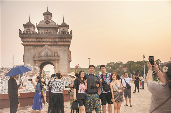 近日,中國游客在老撾首都萬象著名地標景點凱旋門前拍照。“五一”假期,許多中國游客搭乘中老鐵路國際旅客列車赴老旅游,領略老撾歷史文化。新華社發 (凱喬 攝)