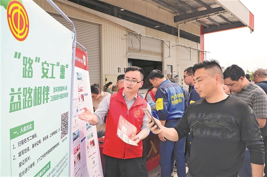 5月6日,在安徽省六安傳化物流園,工會志愿者引導貨車司機現場掃碼入會。