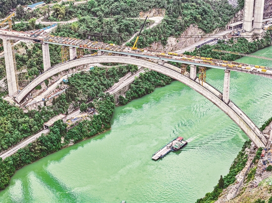這是5月6日拍攝的建設中的渝湘高鐵黃草烏江雙線大橋(無人機照片)。 近日,由中鐵大橋局承建的渝湘高鐵重慶至黔江段黃草烏江雙線大橋順利實現合龍,進入橋面系及附屬工程施工階段。隨著黃草烏江雙線大橋的合龍,由中鐵大橋局承建的渝湘高鐵重慶至黔江段三座橫跨烏江的鐵路橋,已全部完成主體結構施工。