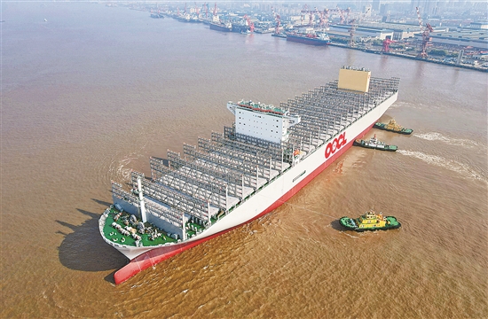當日,由江蘇南通中遠海運川崎船舶工程有限公司自主設計、研發制造的“中遠川崎397”集裝箱船出海試航。該船長399.99米、型寬61.3米,型深33.2米,可裝載24188個國際標準集裝箱。