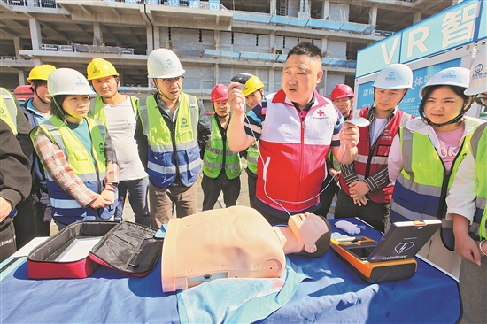 5月8日,江蘇省徐州市鼓樓區一建筑工地,急救培訓教員向工人講解自動體外除擅儀使用方法。