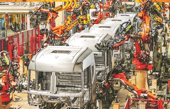 5月7日,安徽馬鞍山經開區漢馬科技重卡全自動焊接生產線上,工業機器人在進行焊接作業。該企業是國內最早進入新能源重卡領域的企業之一,其開發的新能源重卡暢銷國內外市場。
