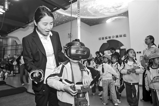 近日,在浙江省湖州市南潯區人民法院道德法治教育實踐基地,小學生們正在通過VR眼鏡進入虛擬法治展館,通過交互技術了解法律條文,身臨其境地體驗沉浸式的普法教育。陸志鵬 攝/中新社