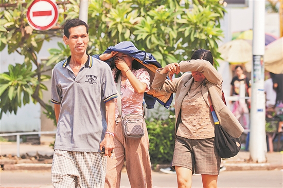 近期,熱浪席卷東南亞和南亞大片地區,老撾也遭遇高溫酷暑侵襲,最高氣溫超40攝氏度,給民眾正常生產生活帶來影響。圖為近日,人們走在老撾首都萬象街道上時用衣物遮蔽自己。