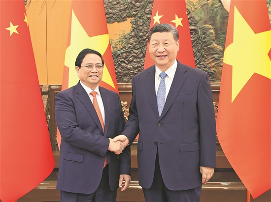 習近平強調,中國堅持全面深化改革、推進中國式現代化,這將為雙方拓展經貿、互聯互通、數字經濟等領域合作帶來新機遇。雙方要保持高層交往,共同推進高質量共建“一帶一路”,提升兩國互聯互通水平,推動兩國務實合作高質量發展。中方愿鼓勵更多中國企業加大對越投入,希望越方為中國企業提供公平、公正、非歧視性的營商環境。雙方要用好兩黨友好交往紅色資源,支持邊境省份加強交流,實施好農業、教育、醫療等民生項目,用好民間、青年等交流平臺,夯實中越友好民意基礎。雙方要妥善處理海上問題,加快推進海上共同開發,共同維護地區和平穩定。