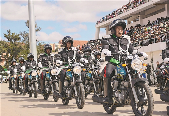 當地時間6月26日,在馬達加斯加首都塔那那利佛,馬達加斯加警察摩托車方陣接受檢閱。當日,馬達加斯加舉行國慶日閱兵活動,慶祝獨立64周年。