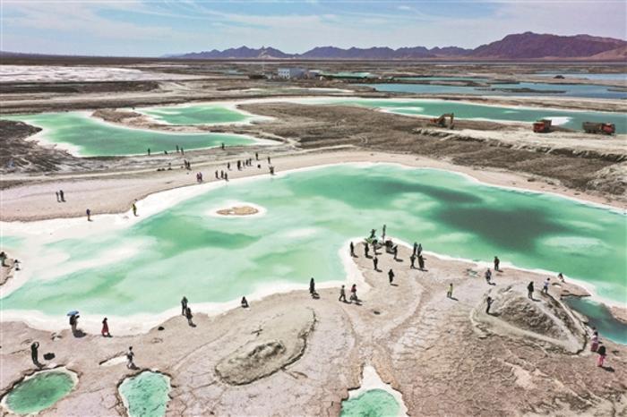 6月26日,青海省海西蒙古族藏族自治州大柴旦翡翠湖色彩斑斕、美不勝收,吸引不少游客在此觀光游覽。中新社發 包康軒 攝