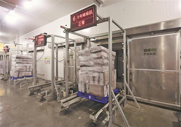 在天津東疆綜合保稅區中創智慧冷鏈有限公司,一批貨物正被AGV自動轉運小車運輸進冷凍庫中(7月3日攝)。