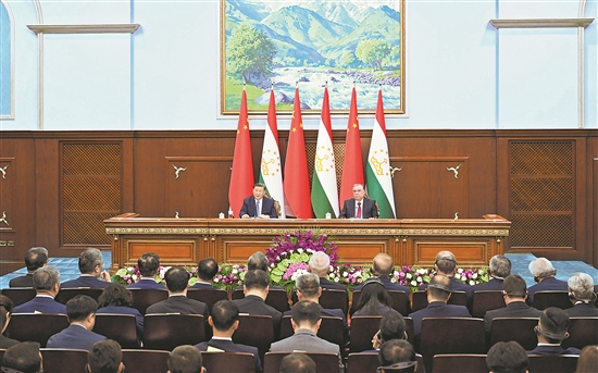 剛才,我同拉赫蒙總統舉行了內容豐富、成果豐碩的會談。我們共同簽署了聯合聲明,宣布建立新時代中塔全面戰略合作伙伴關系,一致決定在更高起點攜手構建世代友好、休戚與共、互利共贏的中塔命運共同體。我們見證交換了20余份政府間、部門間文件,涉及經貿、互聯互通、礦產、安全、人文等領域合作。中塔關系擁有了新定位,開辟了兩國合作新前景。