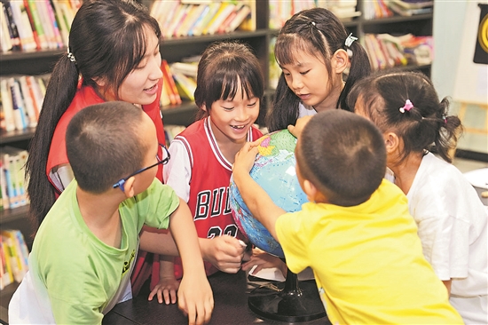7月4日,在重慶市北碚區水土街道和悅家園社區,大學生志愿者在給小朋友介紹地理知識。暑期,水土街道和悅家園社區、北碚區和愛社會工作服務中心聯合開展為期2個月的“社區帶娃驛站”公益服務活動,招募大學生志愿者為臨時輔導教師,為小朋友們提供托管照看服務,與孩子們一起開展文體游戲、手工制作等活動,豐富孩子們的暑假生活。