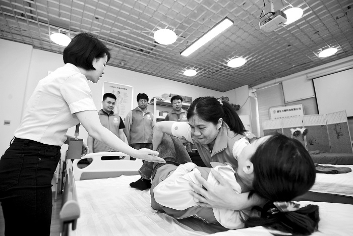 7月2日,一名學員正在貴陽市南明區嘉安月嫂科技有限公司職業培訓教員的指導下學習家庭護理中的翻身。近年來,當地以就業市場需求為導向,依托轄區內的家政服務機構開設“家政技能培訓班”,搭建就業供需平臺,拓寬就業渠道。本報通訊員 趙松 攝