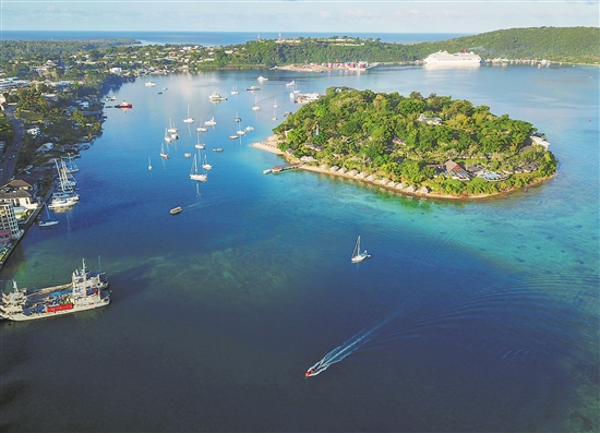 這是近日拍攝的瓦努阿圖首都維拉港風光(無人機照片)。瓦努阿圖位于太平洋西南部,由約80個島嶼組成,屬于太平洋三大群島之一的美拉尼西亞群島。瓦努阿圖屬熱帶雨林氣候,雨量充沛,叢林茂密,土地肥沃。