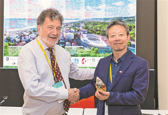 當地時間7月9日,在意大利佩斯卡拉,會議主辦方之一、國際相對論天體物理中心網絡主任雷莫·魯菲尼(左)為李菂頒獎。