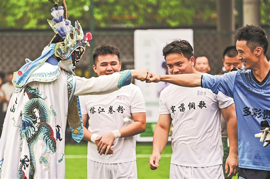 7月10日,川劇演員(左一)在比賽間隙和貴州榕江“村超”文旅隊球員互動。