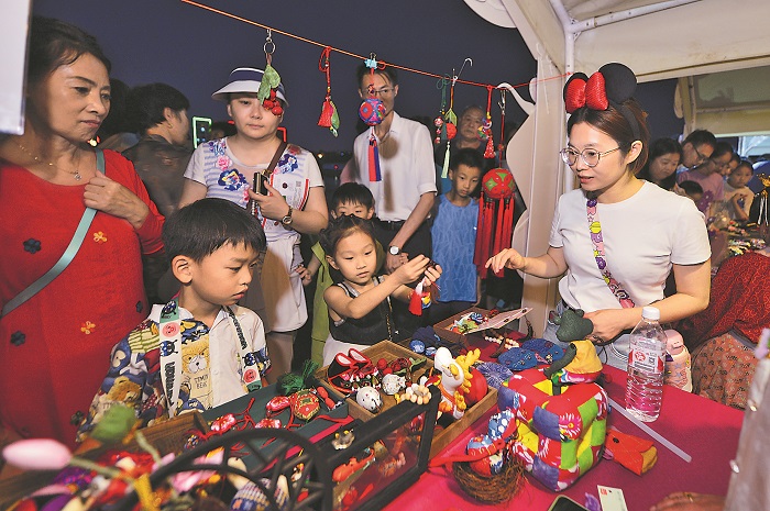 7月11日,在山東省青島市城陽區流亭街道白沙河畔,游客在非遺市集上選購手工布藝。進入暑期,青島市城陽區不斷豐富夜間經濟消費業態,通過舉辦非遺文化節、非遺市集等各種文旅活動,滿足市民的消費需求。本報通訊員 王海濱 攝