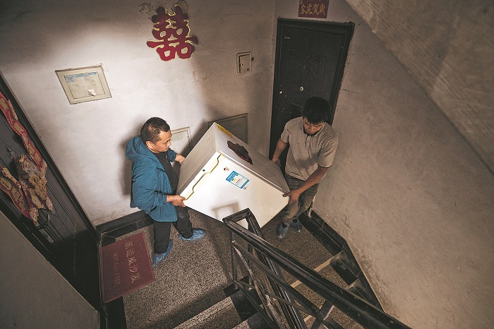 7月3日,家電回收員在一個老舊小區的單元樓內搬運舊冰柜。