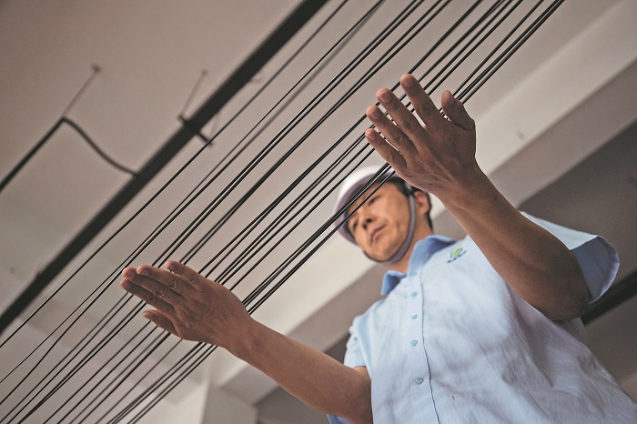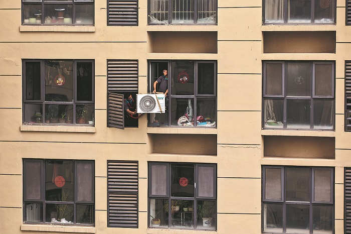7月6日,空調安裝工正在高層住宅樓上為客戶安裝空調。