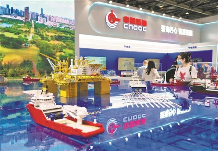 7月13日,參觀者在北京科博會現場參觀中國海油深水油氣田勘探開發模型。