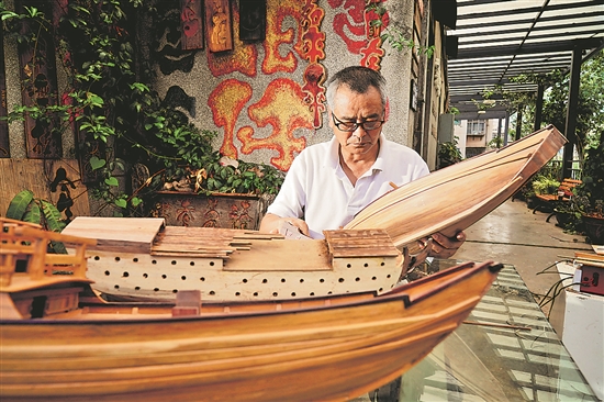 近日,云南昆明,付昆祥在工作室制作鄭和船隊模型。