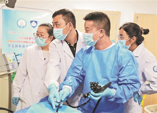 在西藏自治區日喀則市人民醫院,胡健衛(左二)指導徒弟張武(左三)進行內鏡手術(7月8日攝)。