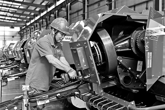 7月13日,在位于濟寧市兗州區(qū)的愛科(濟寧)農(nóng)業(yè)機械有限公司,工作人員在生產(chǎn)打捆機。