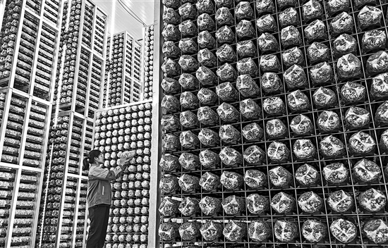 7月14日,山東萊西市院上鎮一家菌菇培育加工企業的工作人員在查看菌棒的生長狀態。近年來,山東青島萊西市立足農業產業優勢,因地制宜做好“土特產”文章,培育一批鄉村優勢特色產業,形成了菌菇等特色產業集群遍地開花的現代農業發展模式,可年產各類食用菌培養基3000余萬包,食用菌鮮品2萬余噸,總產值3億元,帶動農民致富。