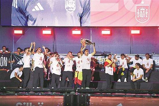 當地時間7月15日,西班牙隊球員高舉歐錦賽冠軍獎杯,與球迷一同分享奪冠喜悅。