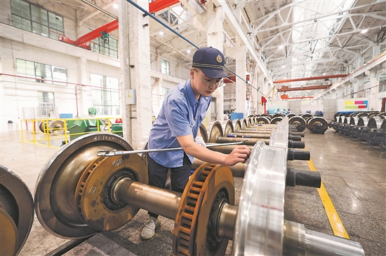 連日來,福建多地出現40℃以上的高溫天氣,為給旅客打造舒適涼爽的旅途環境,南鐵福州車輛段干部職工頂著高溫做好列車制動裝置、空調裝置、車電裝置等關鍵設施設備的故障檢修工作。圖為車輛鉗工在測量客車車輛輪對尺寸。