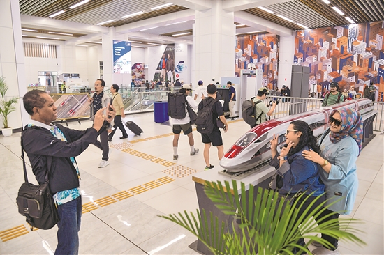 當(dāng)?shù)貢r(shí)間7月17日,在印度尼西亞雅加達(dá)哈利姆站候車大廳,乘客與雅萬(wàn)高鐵高速動(dòng)車組模型合影。