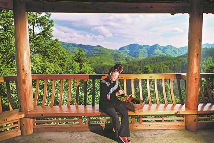 控拜村村民楊通英在自己家的涼亭內縫制苗族服飾(7月10日攝)。