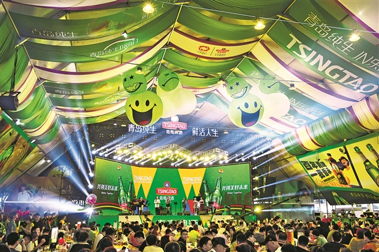 7月19日,人們在青島西海岸新區金沙灘啤酒城內參加啤酒節。