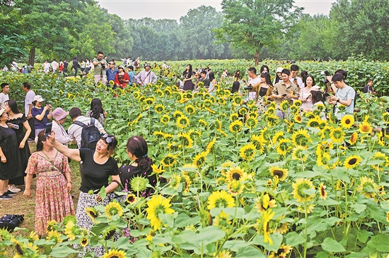 據了解,奧森公園的向日葵種植面積近4萬平方米,是北京城區內種植規模最大、品種最全的向日葵觀賞區。在這里,游客可以觀賞到20余種稀有向日葵,沉浸式暢游花海。本報記者 王偉偉 攝