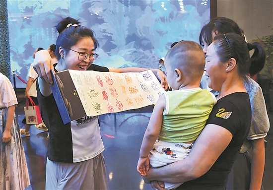 圖為7月18日,游客在遼寧省沈陽市沈陽博物館高興地展示蓋完的二十四節(jié)氣印章。