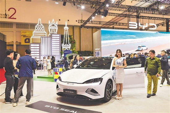 近日,在印度尼西亞萬丹省唐格朗的印尼會展中心,人們參觀2024年印尼國際汽車展上的中國汽車品牌比亞迪展臺。