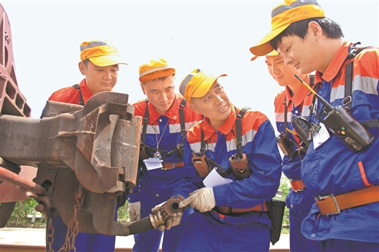 中國鐵路上海局集團(tuán)有限公司鎮(zhèn)江站大力開展“戰(zhàn)暑運(yùn)、保安全、促增收”攻堅(jiān)戰(zhàn),聚焦班組一線,組織師帶徒培訓(xùn)來提高職工業(yè)務(wù)技能,確保安全穩(wěn)定運(yùn)行。圖為該站管轄的丹陽東站榮獲“上鐵工匠”的調(diào)車長孫偉正在傳授調(diào)車作業(yè)技能,帶動班組人員學(xué)技練功。胡偉忠 攝