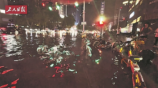 7月22日晚,受強對流天氣影響,河南鄭州突降暴雨,短時強降水造成鄭州城區多處積水,部分公交線路臨時停運。鄭州市氣象臺升級發布暴雨橙色預警信號,提請注意防范強降雨引發的城市內澇、中小河流洪水等次生災害。(本報記者 余嘉熙)